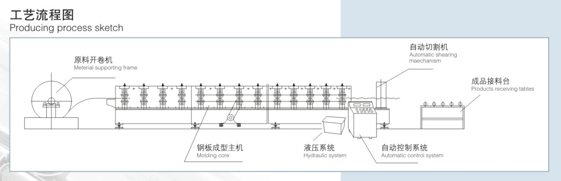 開卷機(jī) 成型主機(jī) 液壓切刀 電控系統(tǒng) 液壓系統(tǒng) 出料架